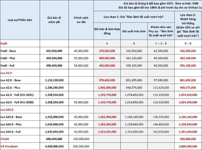 Bảng giá xe VinFast áp dụng từ ngày 01/06/2021 như sau: